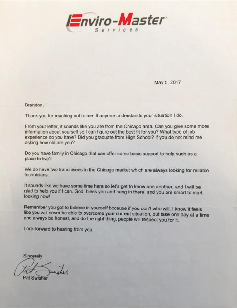 Brandon Laster sent letters to a number of businesses seeking a job upon his release from prison. He sent one of those letters to Mr. Pat Swisher, Chairman and Chief Executive Officer of Enviro-Master. Mr. Swisher was familiar with the difficulties people face when they are released from prison as he had been incarcerated and served time behind bars years earlier. Thus, when returning citizens asked for help, Mr. Swisher was willing to consider their individual situations.