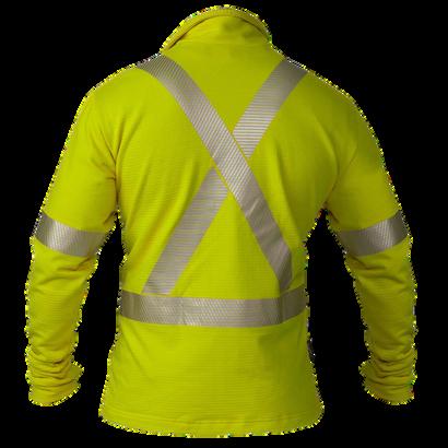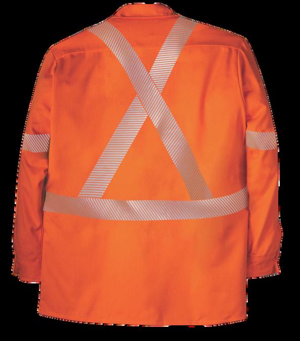 1 left chest pocket | High resistance Nomex® thread on all seams and bar-tacked at all stress points | Relaxed fit, elastic knit collar and thumb hole at cuff | Reflective material placement provides 360-degree visibility with “X” on back.