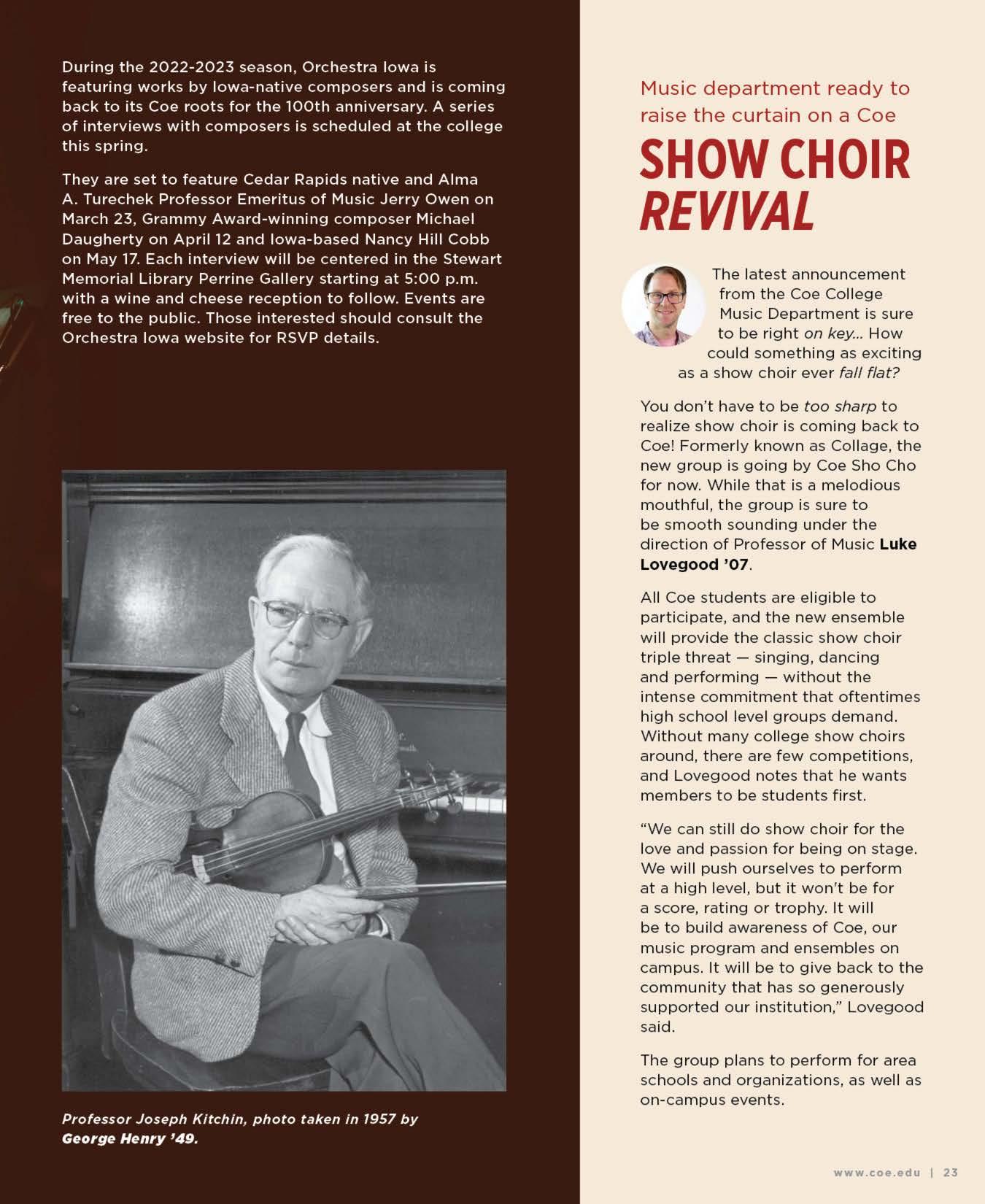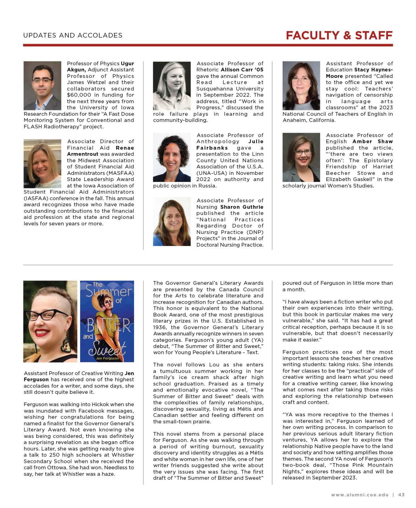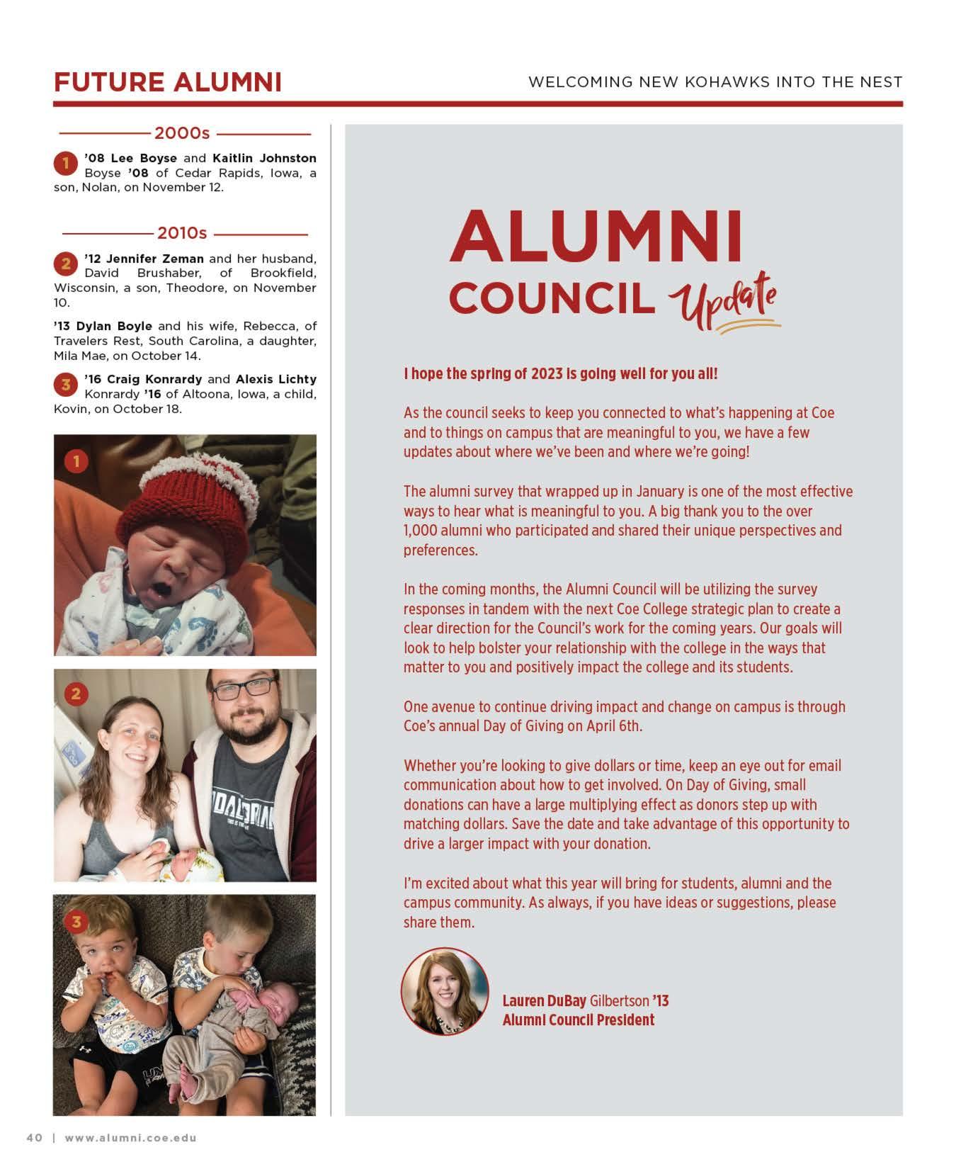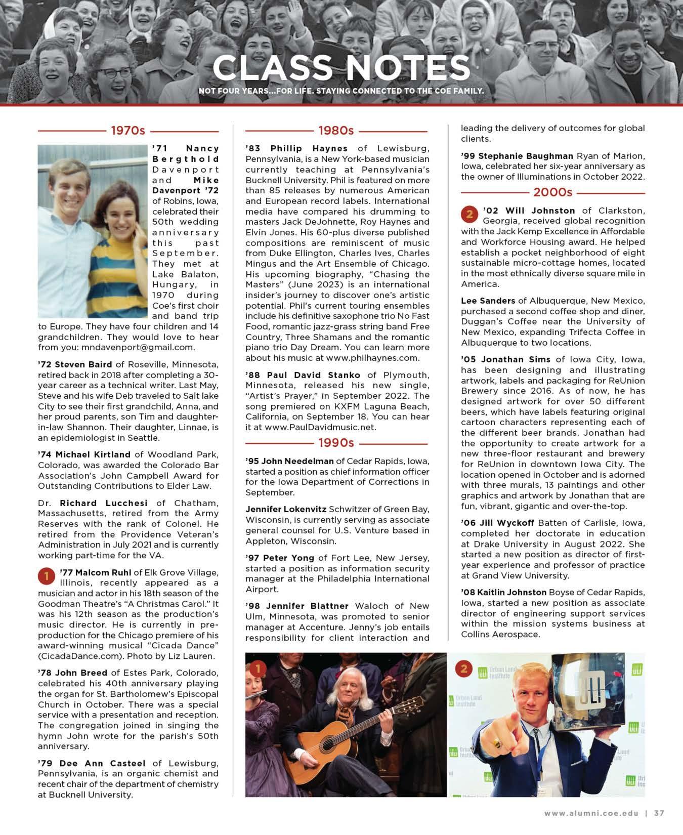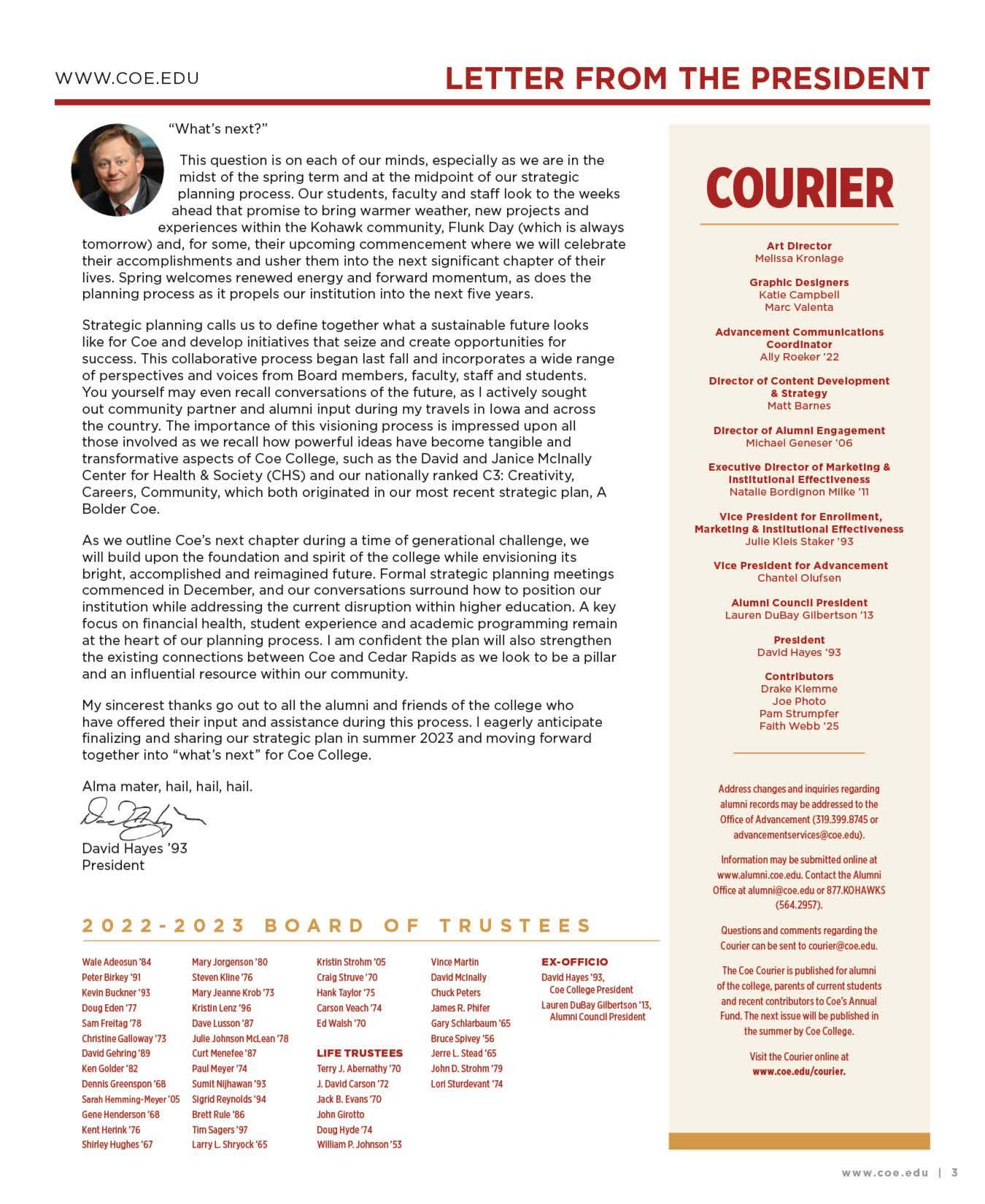 My sincerest thanks go out to all the alumni and friends of the college who have offered their input and assistance during this process. I eagerly anticipate finalizing and sharing our strategic plan in summer 2023 and moving forward together into ''what's next" for Coe College.