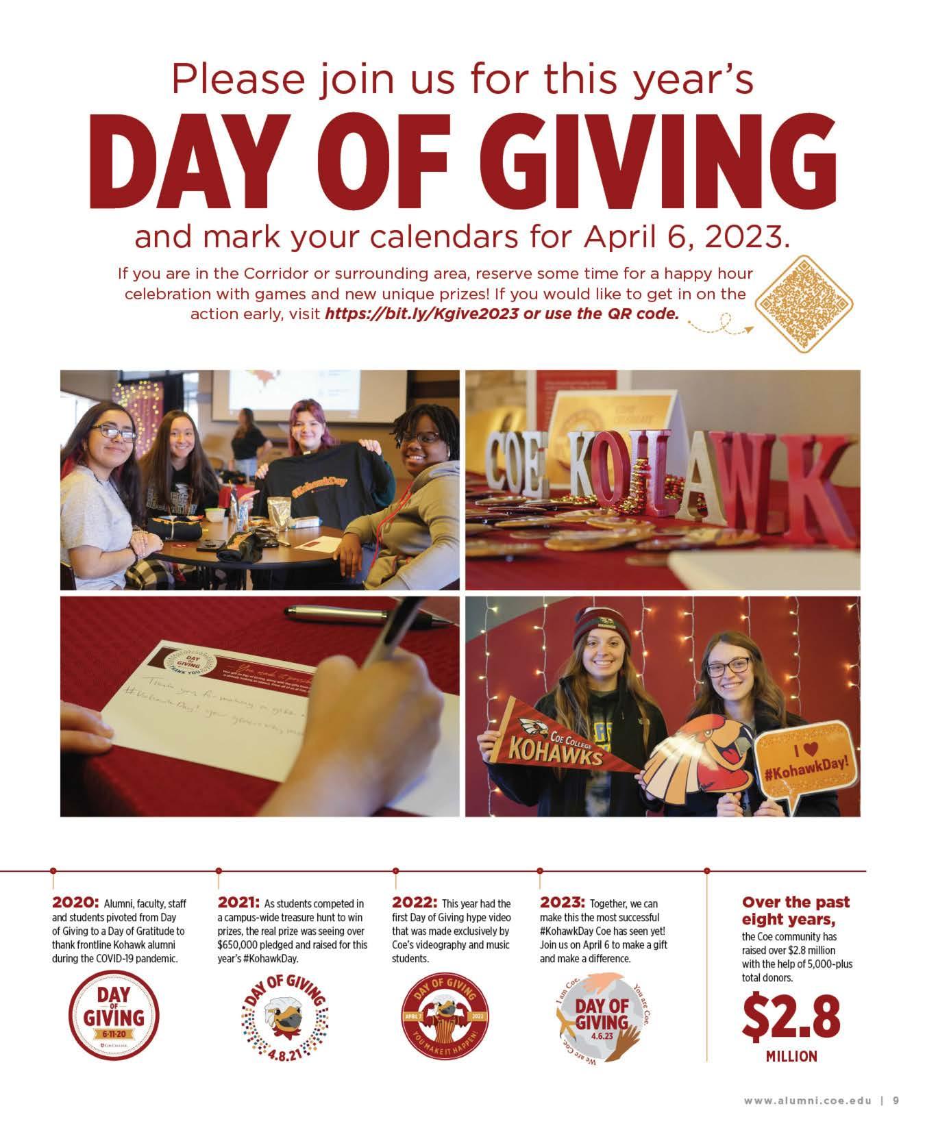 #Koha·wkDayJ began in 2015 with the purpose of bringing alumni., ·family, ·facultyJ staff! students and friends together. This day is a vehicle for Kohaw·ks around the world to unite to create excitement! reminisce and .support the Coe Annual Fund. Giving days are not unique to Coe,. and small colleges around the country embrace a day o·f celebration and support every year. It al lows us to bui Id momentum into the next fiscal year, and most importantly,. continue to create opportunities for the next generation of students.