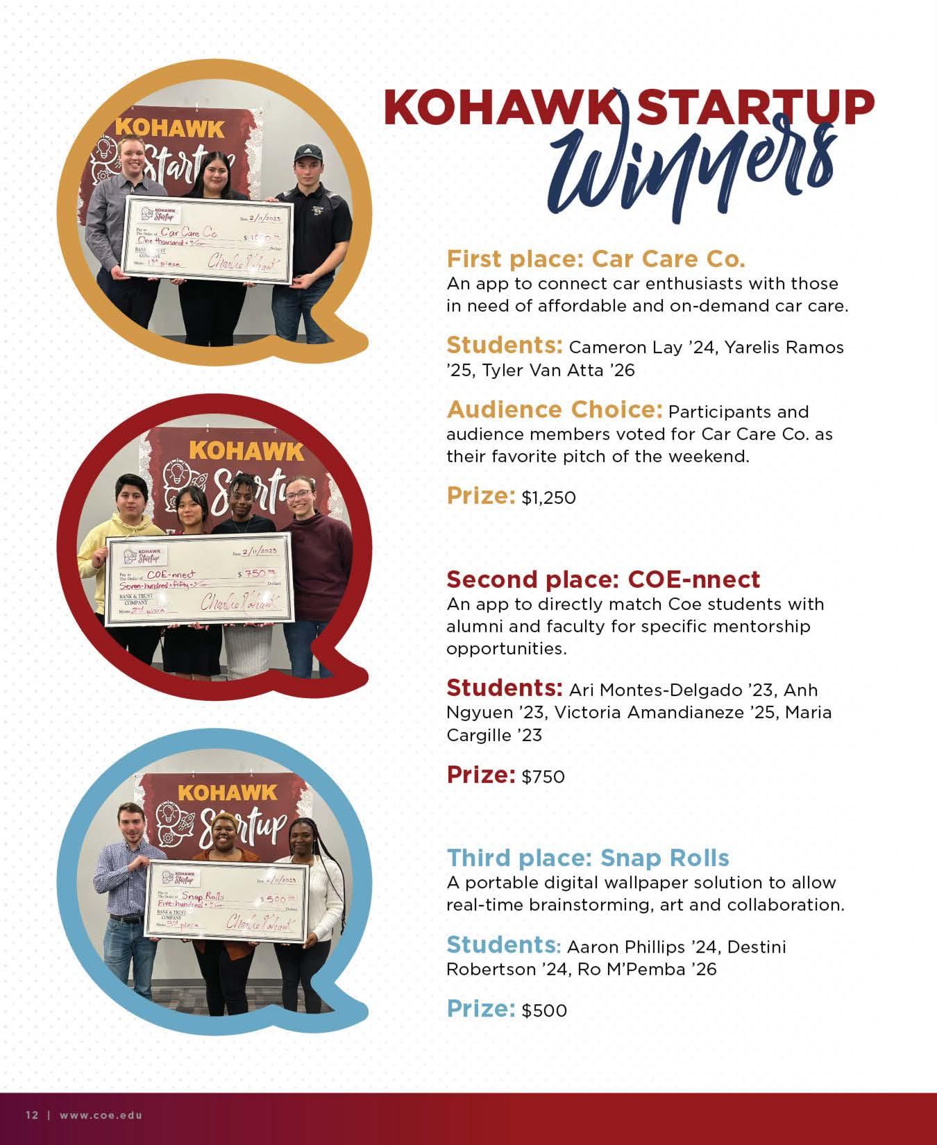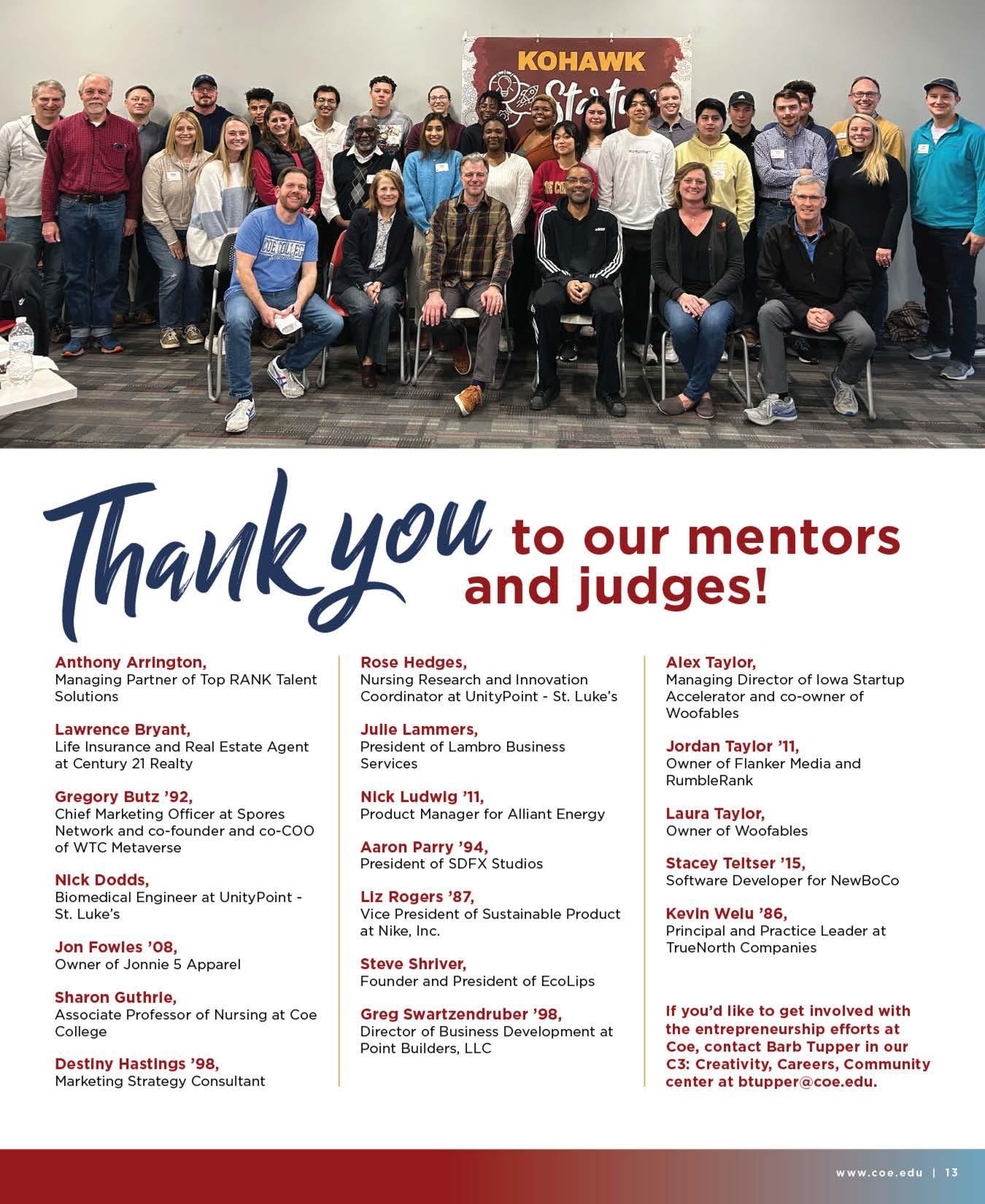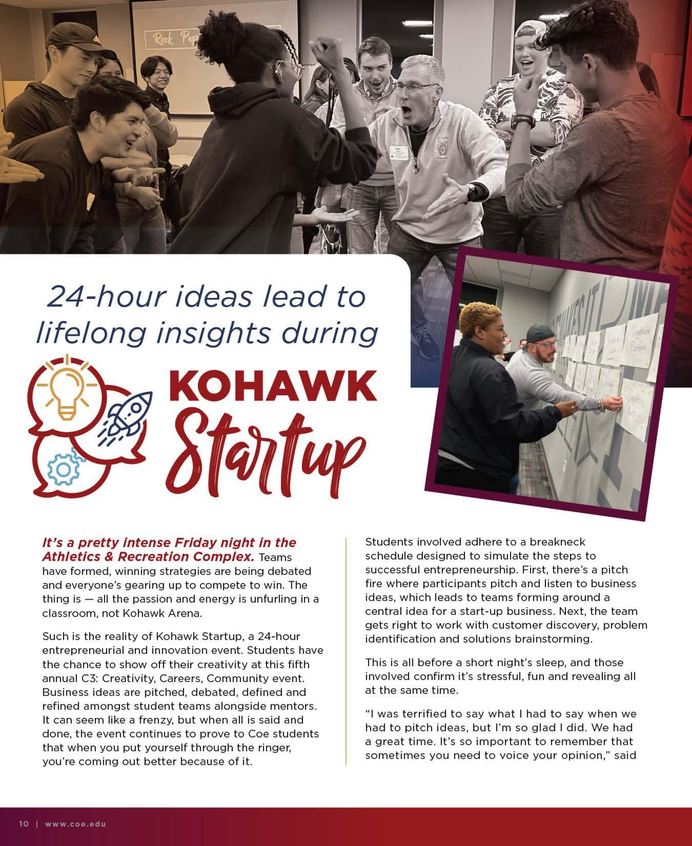 Such is the reality of Kohawk Startup, a 24-hour entrepreneurial and innovation event. Students have the chance to show off their creativity at this fifth annual C3: C.reativity C.areersj Community event. 1 Business ideas are pitched, debatedJ defined and refined amongst student teams alongside mentors. It can seem like a frenzy, but when all is said and done the event continues to prove to Coe students that when you put yourself through the ringer, you're coming out better because of it.