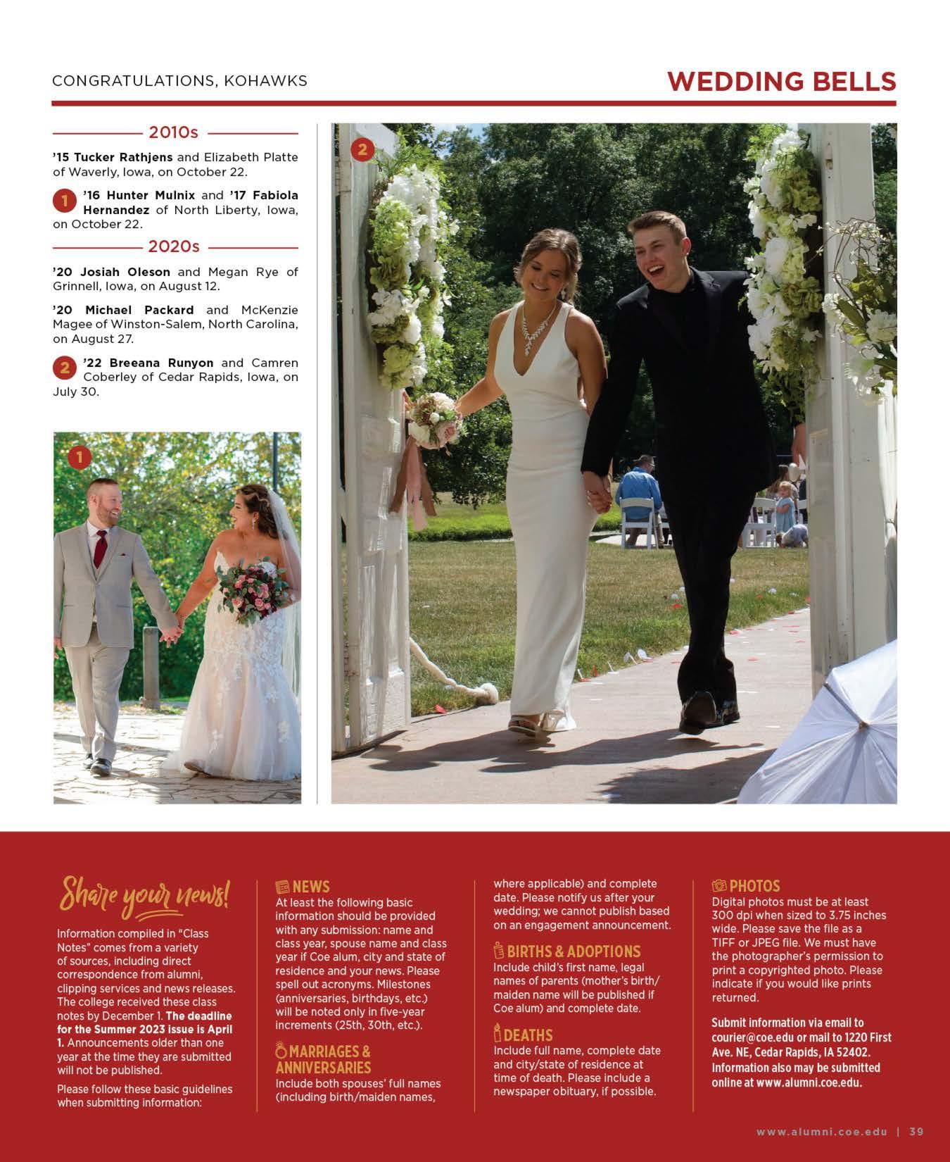 InformationmaybesubmittedonHneat www.alumni.coe,.eduContacttheAlumni Office,at alumni@coe.edu,or877J<OHAWKS {5'64.2957).