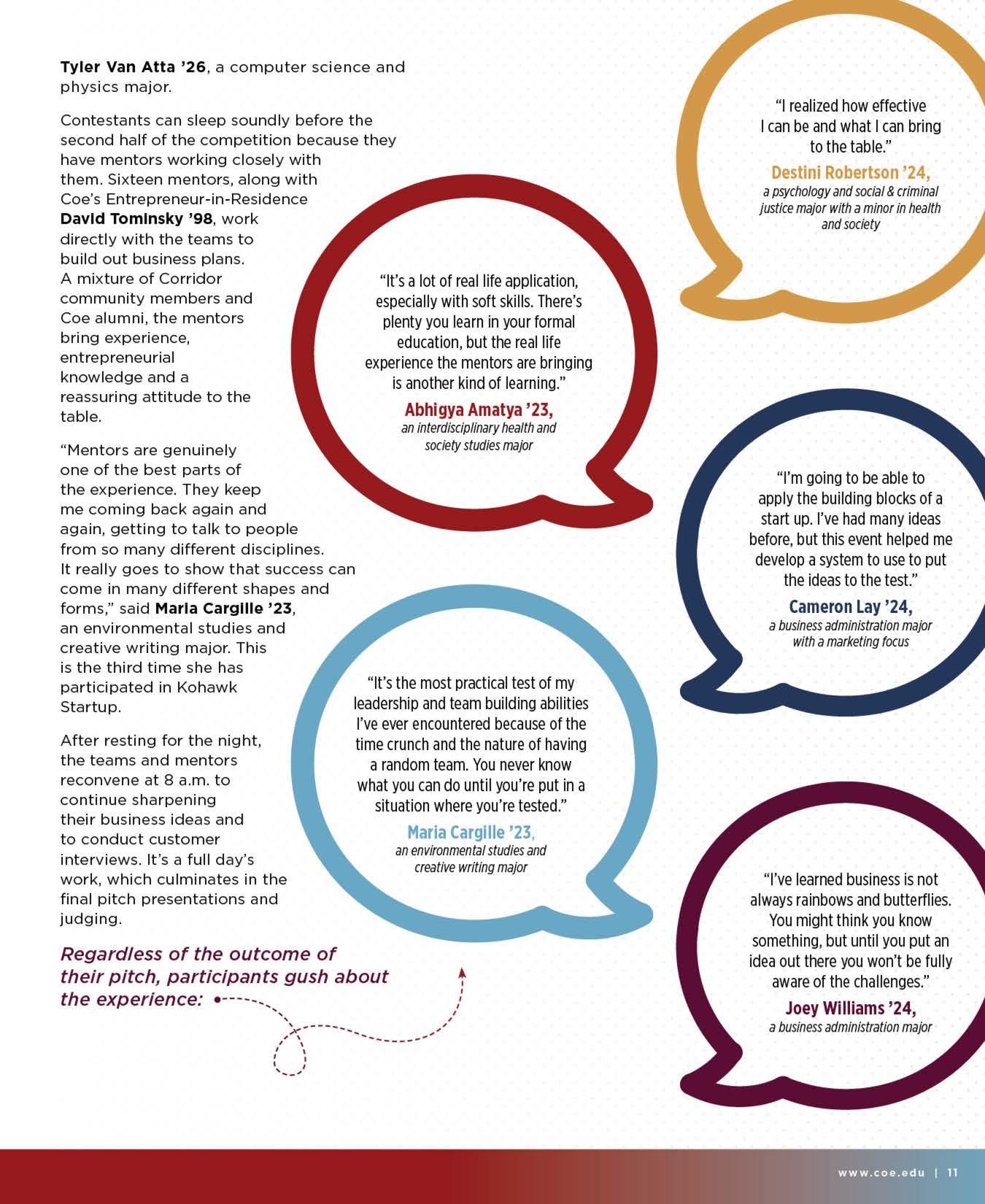 HMentors are genuinely one of the best parts of the experience. They keep me coming back again and againJ getting to talk to people from so many different disciplines. It really goes to show that success can come in many different shapes and forms-JJ said Ma1rllaCarg1lllle1'23, an environmental studies and creative writing major. This is the third time she has participated in Kohawk