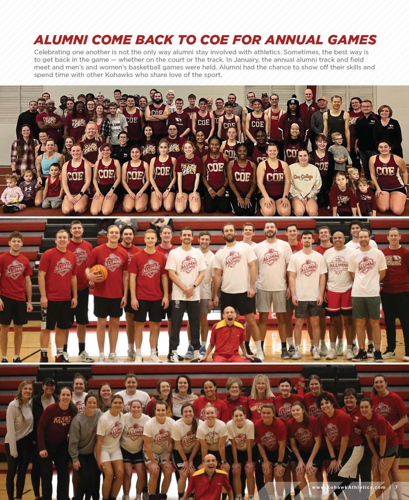 Celebrating one another is not the only way alumni stay involved with athletics. Sometimes the best way is to get back in the game -whether on the court or the track. In January, the annual alumni track and field meet and men 1 s and womenjs basketball games were held. Alumni had the chance to show off their skills and spend time with other Kohawks who share love of the sport.