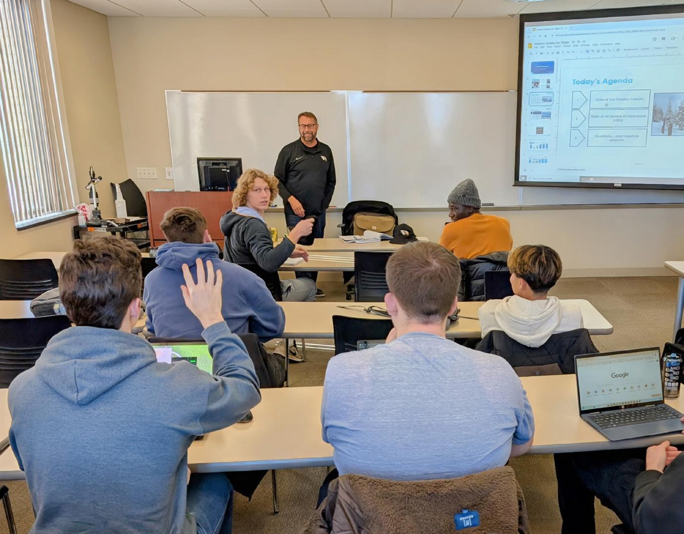 Lenss teaches the frst Introduction to Aviation course at Coe, leading a full class in Stuart Hall.