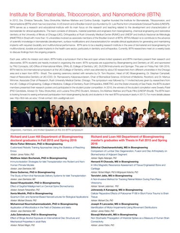 Institute for Biomaterials, Tribocorrosion, and Nanomedicine (IBTN) In 2012, Drs. Christos Takoudis, Tolou Shokuhfar, Mathew Mathew and Cortino Sukotjo together founded the Institute for Biomaterials, Tribocorrosion, and Nanomedicine (IBTN) which has two branches: A US branch and a Brazilian branch (co-founded by Dr. Luis Rocha from Universidade Estadual Paulista (UNESP)). IBTN serves as a research and educational institute with its main focus on the research and teaching related to the development and characterization of biomaterials for clinical applications. The team consists of clinicians, material scientists and engineers from bioengineering, chemical engineering and restorative dentistry at the University of Illinois at Chicago (UIC), Orthopedics at Rush University Medical Center (RUMC) and UNESP and Instituto Nacional de Metrologla (INMETRO) in Brazil with more than 15 universities involved as associate members of the Brazilian branch of IBTN. IBTN’s Mission is to contribute to the advance of scientific knowledge in biomaterials (development, surface modifications and characterization) for versatile clinical applications for generating and maintaining implants with required durability and multifunctional performance. IBTN aims to be a leading research institute in the area of biomaterial and bioengineering for multifunctional, durable and safer implants in the health care sector, particularly in dentistry and orthopedics. Currently, IBTN researchers meet on a weekly basis to discuss findings from the ongoing projects. Each year, within its mission and vision, IBTN holds a symposium that is free and open where invited speakers and IBTN members present their research and discoveries. IBTN students are heavily involved in organizing the event. IBTN symposia are supported by Bioengineering and Dentistry at UIC and sponsored by TMJ Concepts, UIC-Office of International Affairs, ORAL-B, College of Dentistry, UIC, DUCOM Instruments and Springer. This year on Friday Feb 19th 2016, IBTN held its 3rd international symposium at the UIC-College of Dentistry, which was attended by about 50 researchers from different universities in the Chicago area and a team from IBTN - Brazil. The opening ceremony started with remarks by Dr. Tom Royston, Head of UIC Bioengineering, Dr. Stephan Campbell, Head of Restorative Dentistry at UIC-COD, Dr. Ramaswamy Kalyanasundaram, Chair of Biomedical Science, UI-School of Medicine, Rockford, and Dr. Markus Wimmer, Associate Chair of Research, Rush University Medical Center, Chicago. The symposium was followed by 11 invited lectures given by researchers from the UIC College of Engineering, College of Medicine, College of Dentistry, Rush Orthopedics, INMETRO, and the State University of Sao Paolo; the IBTN student members presented their research posters and participated in the student poster competition. In 2016, the winners of the student completion were Sweetu Patel (PhD Candidate, Advisor Dr. Tolou Shokuhfar), and Luciana Trino (PhD Student, Advisors, Drs Mathew Mathew and Paulo Filho (UNESP-Brazil)). The IBTN team is looking forward to seeing enhanced participation from bioengineering faculty and students in the next IBTN symposium (early in 2017). For more details please see: http://ibtn.lab.uic.edu/. Email contact: ibtn.usa@gmail.com