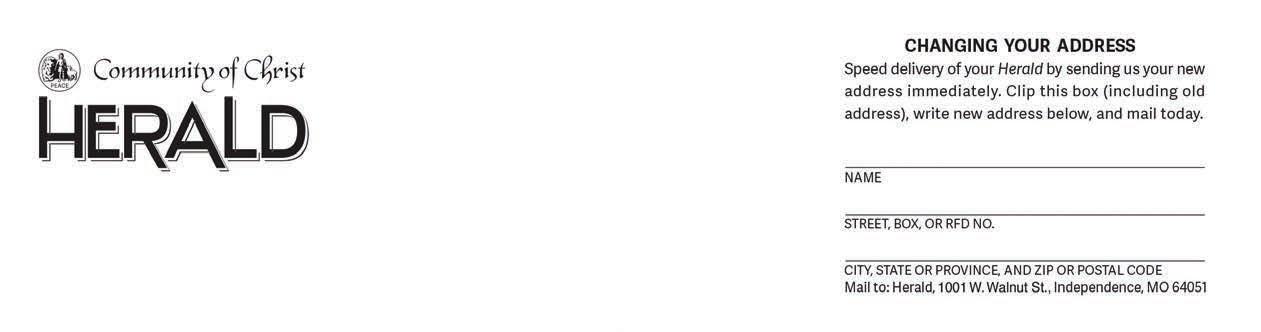 Please submit news and feature items to Herald@CofChrist.org or mail to: Herald, 1001 W. Walnut St., Independence, MO 64050.