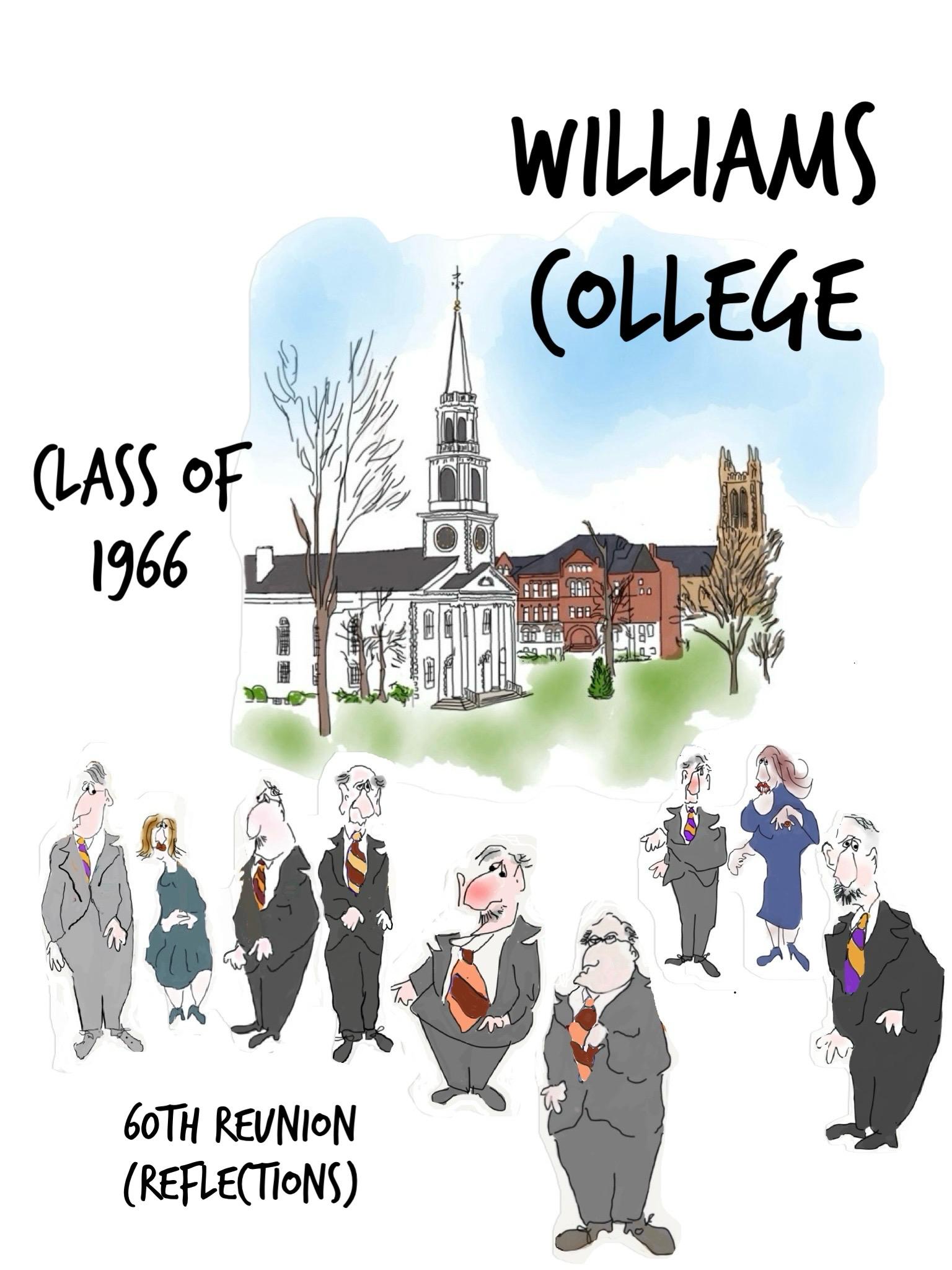 Graced by the well-written and thoughtful and heartfelt reflections (is this, in part, a reflection of their Williams education?) of 1966 classmates (thanks so much to everyone who contributed theirs!) and the splendid cartoons of classmate Dan Cohn-Sherbok, edited lovingly by yours very truly, and with the emphatic support of reunion organizers Budge Upton and Allen Rork and our class Director of Alumni Engagement, Heather O’Brien, the book you are now about to flip through is a compilation of our recollections, ruminations, reflections, and opinions formed since our formative and impactful years in Billsville. How very special to have this tome now, just a few months before we (hopefully many of us) will reunite on our beloved campus to reconnect, share memories, and opine together