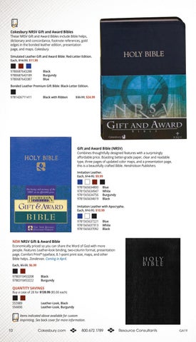 These NRSV Gift and Award Bibles include Bible helps, dictionary and concordance, footnote references, gold edges in the bonded leather edition, presentation page, and maps. Cokesbury. Simulated Leather Gift and Award Bible: Red-Letter Edition. Each, $14.99; $11.99