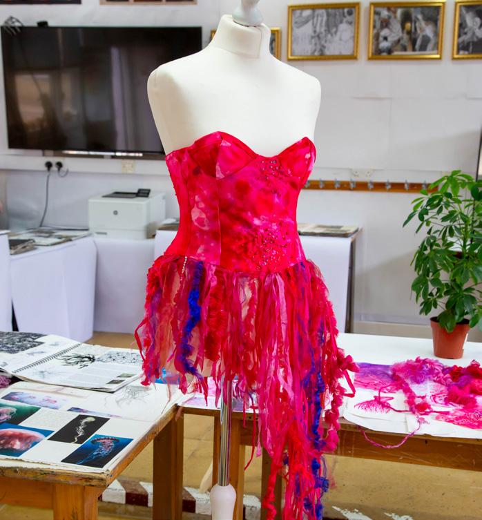 In January of Fifth Form, pupils are given the Externally Set Task paper which includes five possible starting points from which they choose one to work with. In the following three months, they photograph and draw, and experiment with a variety of textile media, then develop ideas on their chosen theme. They then sit a ten hour controlled test where they use their developed idea to produce a textile piece. The Externally Set Task is worth 40% of their GCSE.