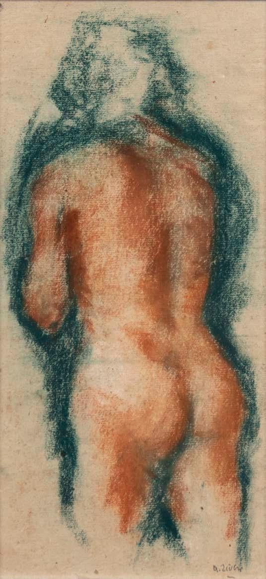 “Nudo di schiena”, 1933, gessetti colorati su carta intelata, firmato in basso a destra, entro cornice