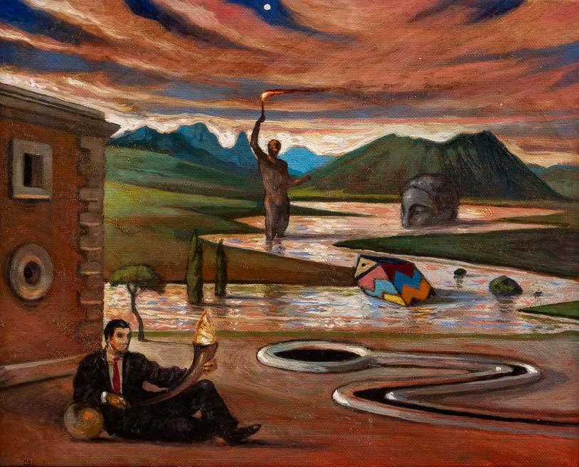 “Piccola allegoria”, 2000, olio su tela di juta, siglato in basso a destra, firmato e datato sul retro 60x50 cm.