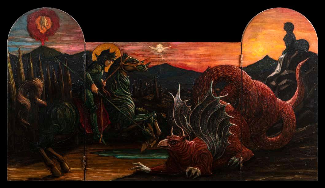 “San Giorgio e il drago con Salomone e Mosè”, 1996, polittico olio su tavola, firmato e datato in basso al centro