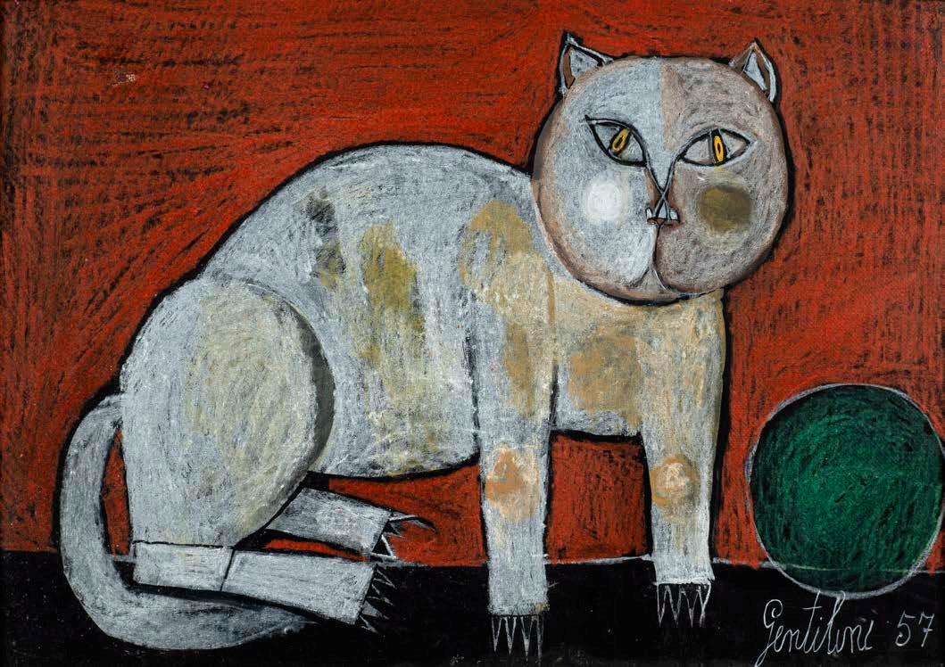 “Gatto”, 1957, olio su tela, firmato in basso a destra, entro cornice 35x50 cm.