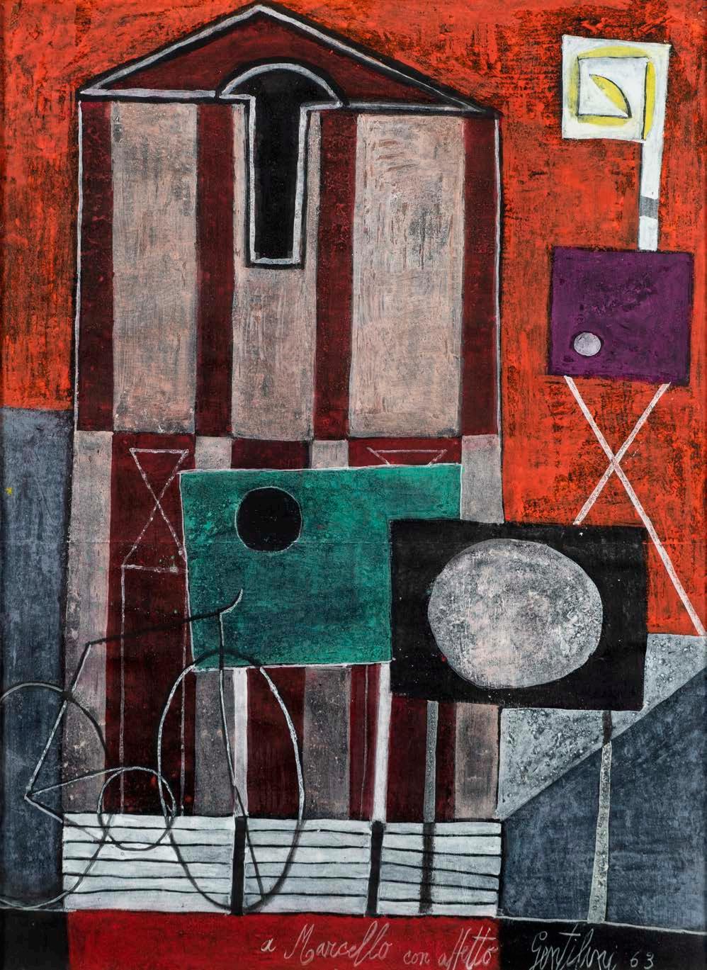“Senza titolo”, 1963, tecnica mista su carta, dedicato, firmata, dedicata e datata in basso a destra, entro cornice 44x32,5 cm. € 4.000/6.000
