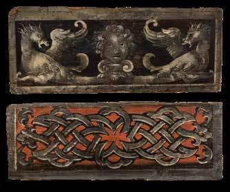 decorato in policromia con motivi di grottesche, manici a foggia di serpenti, difetti e restauri h. 58 cm.