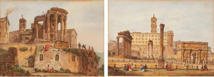 “Veduta del tempio di Vesta di Tivoli-Veduta del Foro Romano”, coppia di acquerelli, entro cornici in legno dorato
