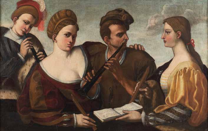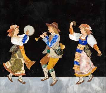 “Scena di festa popolare con figure danzanti”, tempera su carta applicata su tela, entro cornice in