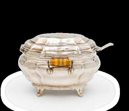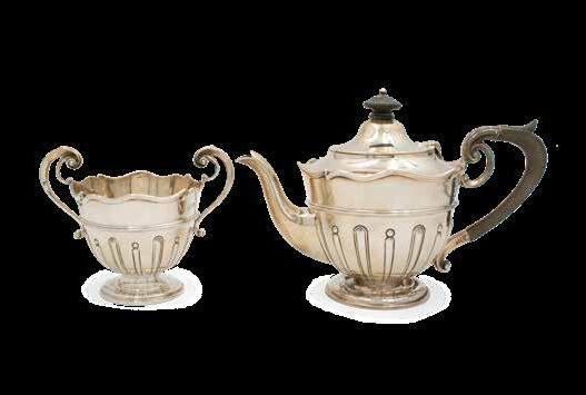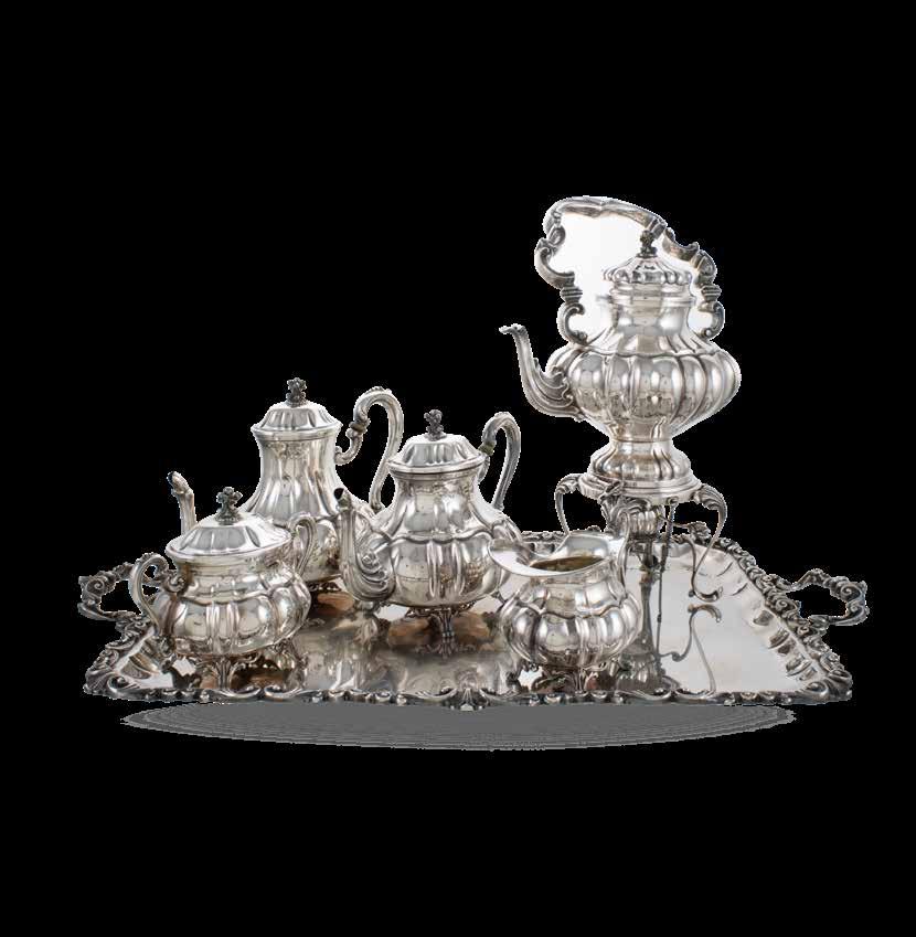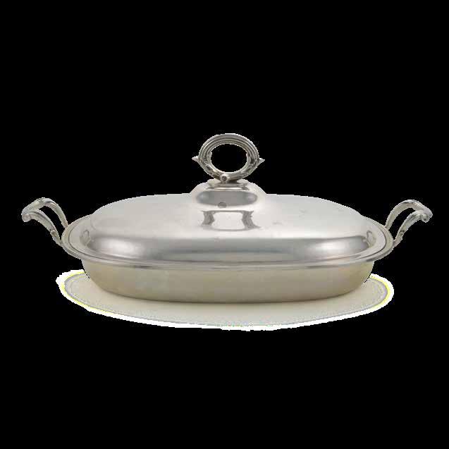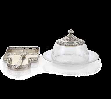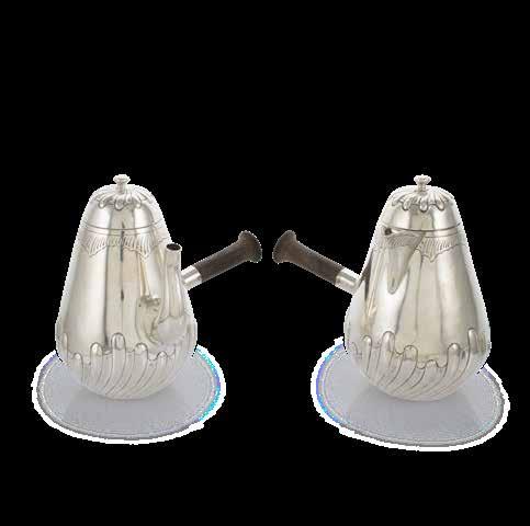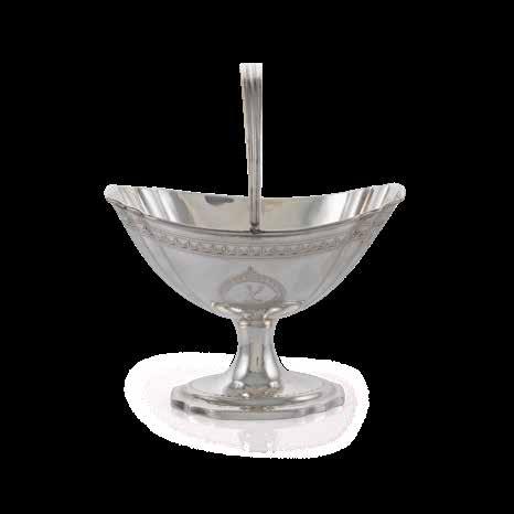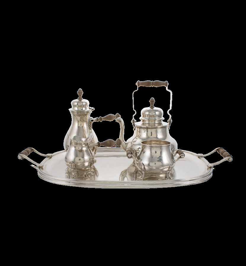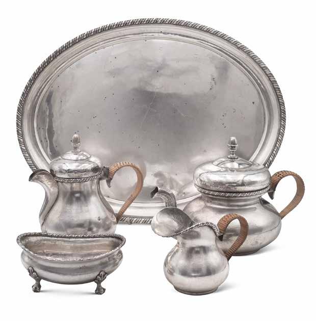 corpo liscio con profili decorati con motivi vegetali e palmette, manici sagomati, completo di piatto e pinza, peso 1027 gr.