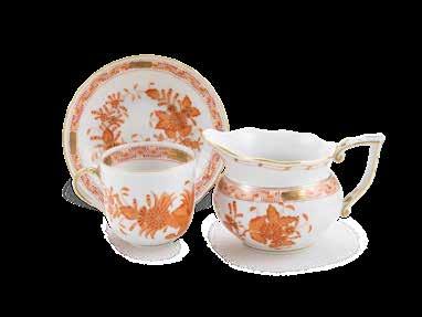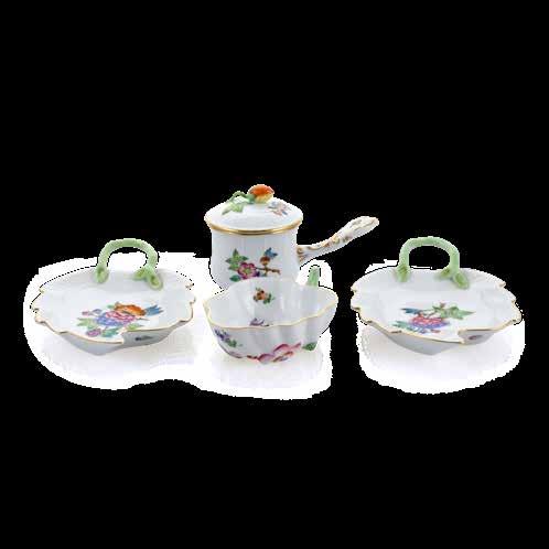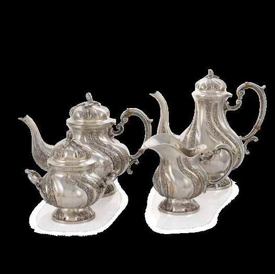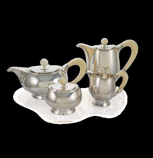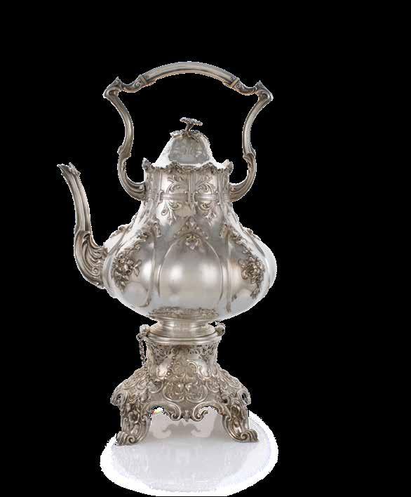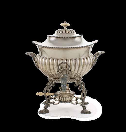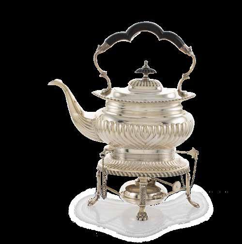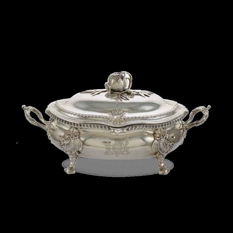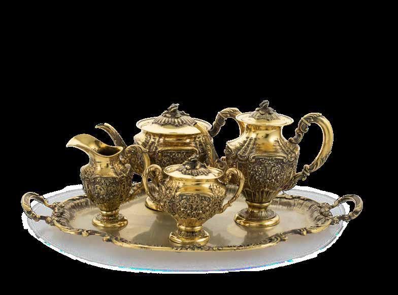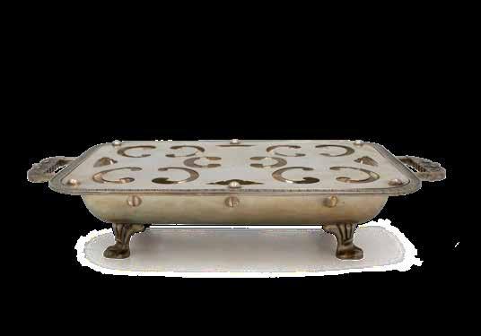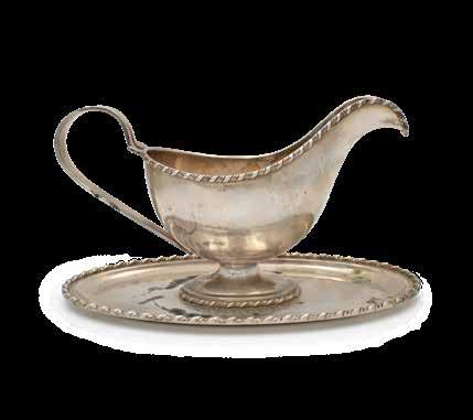 corpo liscio con profili decorati con motivi vegetali e palmette, manici sagomati, completo di piatto e pinza, peso 1027 gr.