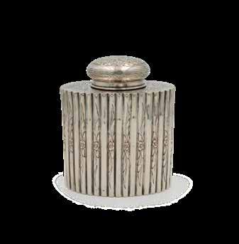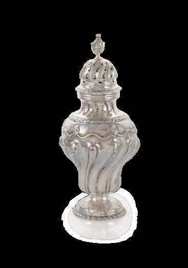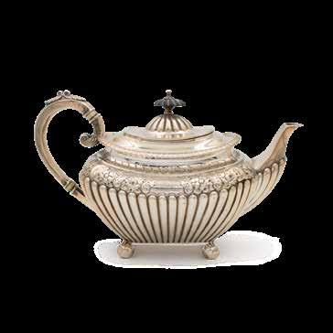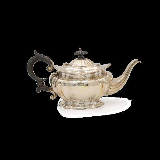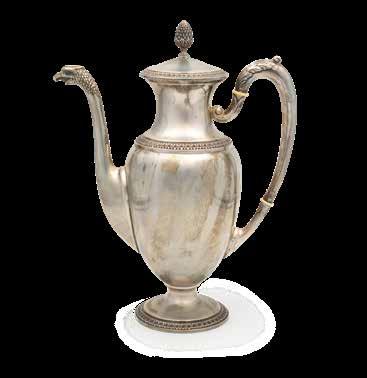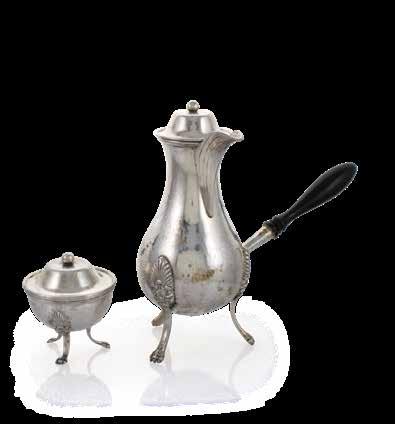 Italia, XX Sec. corpo sbalzato e cesellato con motivi vegetali, profili cesellati con motivi Impero, prese laterali a foggia di volute vegetali, completo di pinza non pertinente, peso complessivo 590 gr.