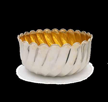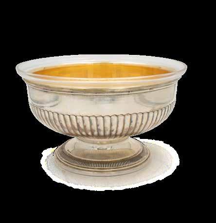 4 CENTROTAVOLA IN ARGENTO Italia, XX Sec. sezione circolare, corpo sbalzato e baccellato, interno in argento dorato con coppa in vetro trasparente, peso 795 gr. 14x24 cm.