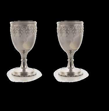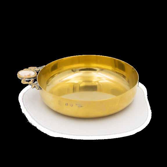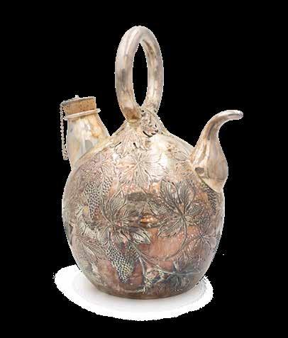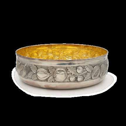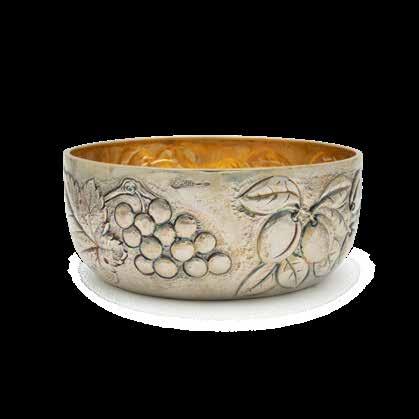 sezione circolare, corpo sbalzato e cesellato con grappoli d’uva e foglie di vite, interno in argento dorato, peso 416 gr.