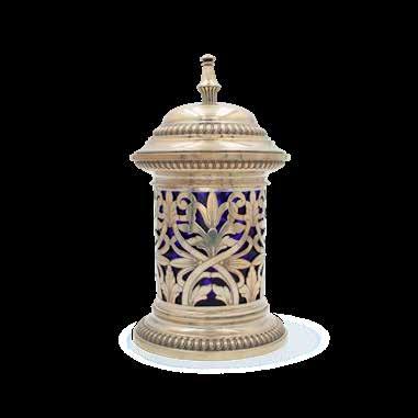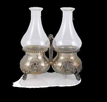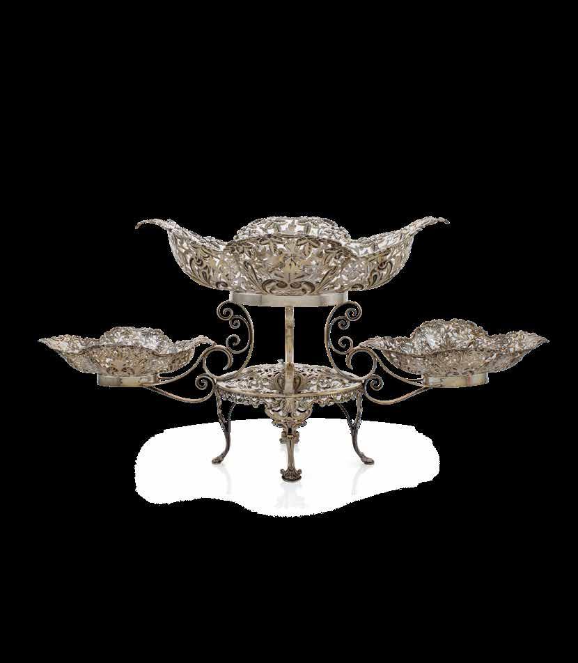 orafo Cesa, Alessandria, sezione circolare con tre contenitori traforati e decorati con motivi di putti danzanti, presa a doppia voluta, completo di tre bottiglie da liquore in cristallo colorato e molato, peso netto 1.000 gr.