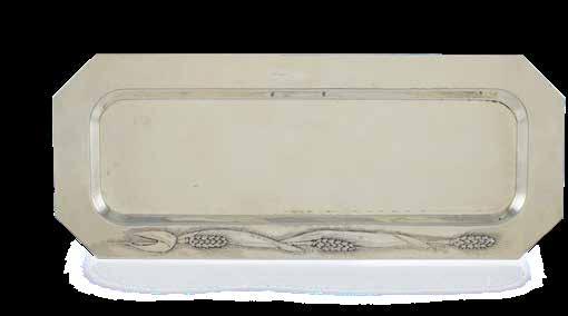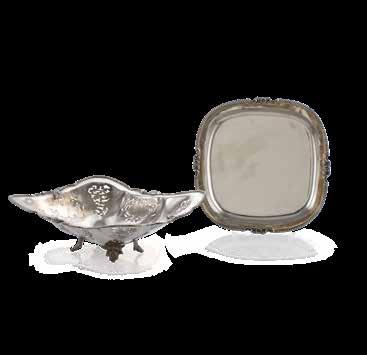 un cestino circolare in argento cesellato con motivi di spighe, 4,5x12,5 cm. un vassoio in argento con tagliacarte, 19x14,5 cm. un posacenere in argento, centrato da una moneta, d. 9,5 cm. peso complessivo 366 gr.