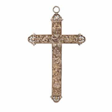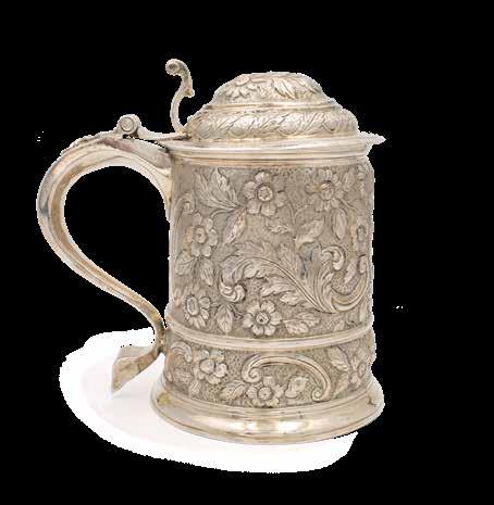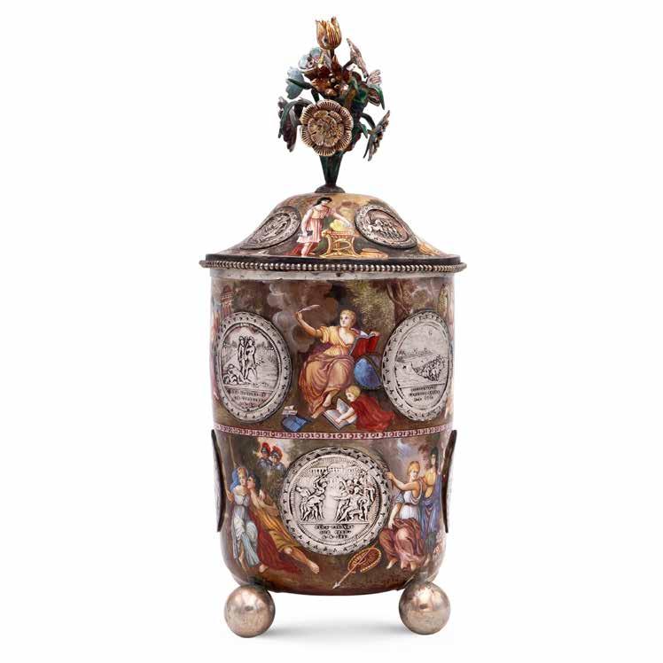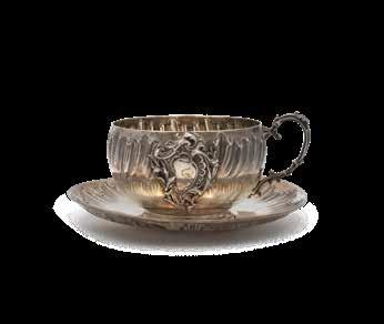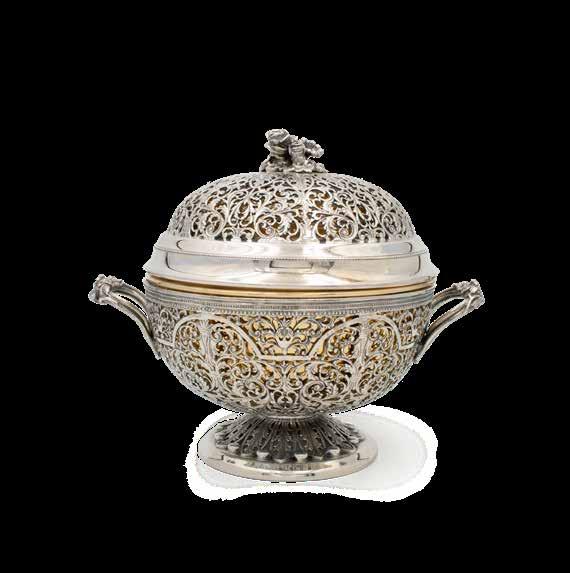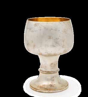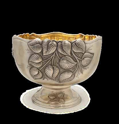 sezione circolare, corpo sbalzato e cesellato con motivi floreali e vegetali, interno in argento dorato, peso 338 gr.