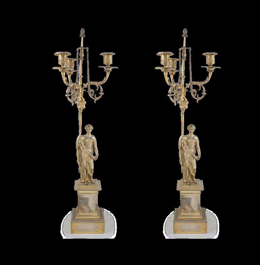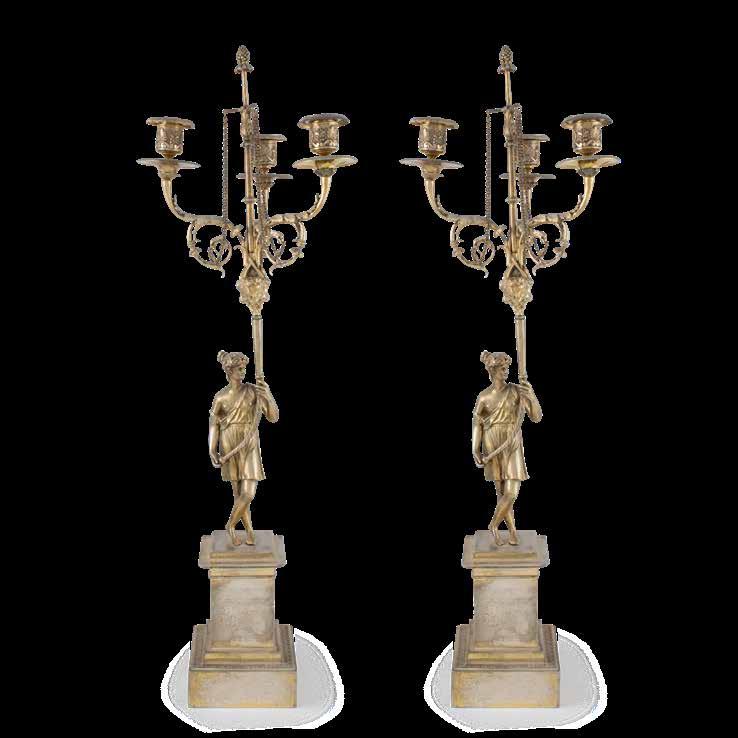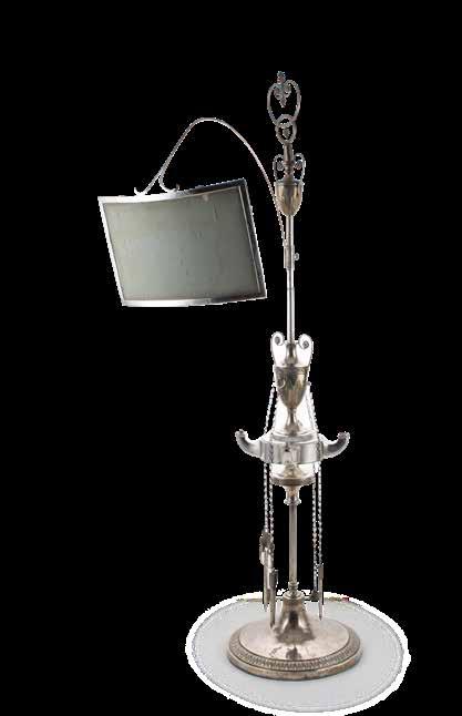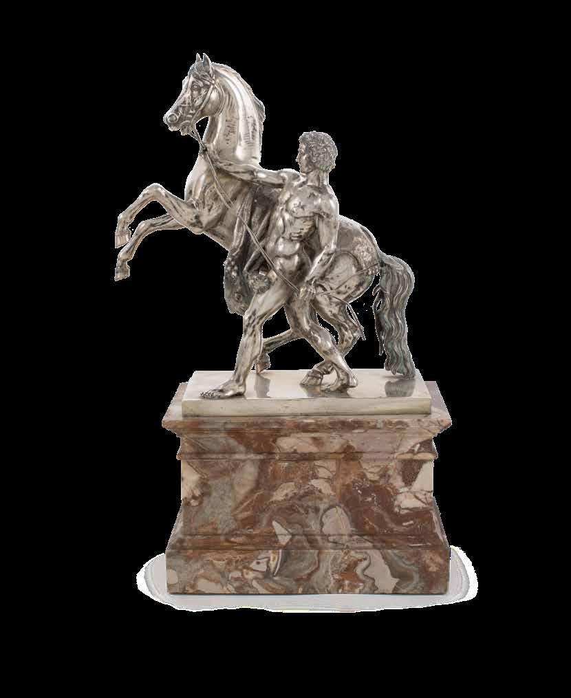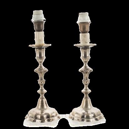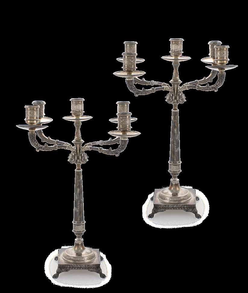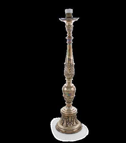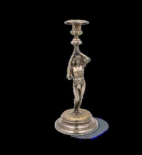 404 CANDELIERE IN METALLO ARGENTATO XIX-XX Sec. corpo cesellato con una figura maschile nell’atto di sorreggere una cornucopia, base circolare