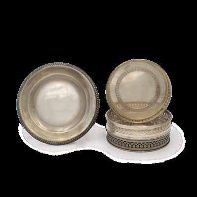 una zuccheriera in argento con coperchio, corpo a torchon uno svuotatasche in argento di linea smerlata un portabottiglia in argento, corpo liscio peso complessivo 604 gr. misura massima 15,5x15,5 cm.