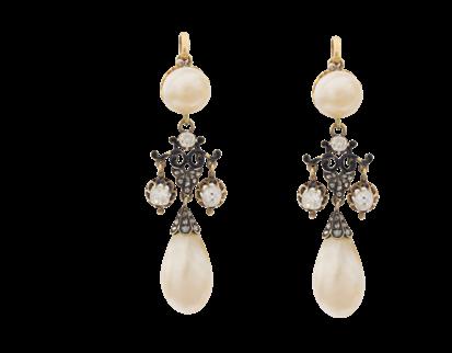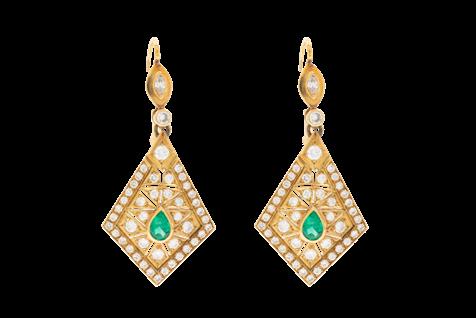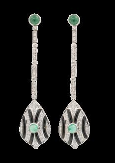 perle 13 mm. circa, diamanti taglio brillante ct 1,50 circa, smeraldi taglio a pera ct 1,30 circa, dimensioni 2,4x1,6 cm. peso 16 gr.