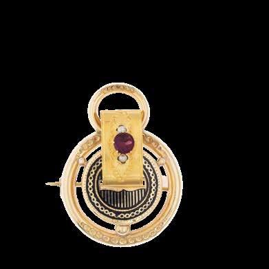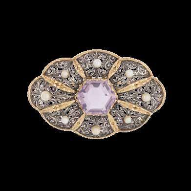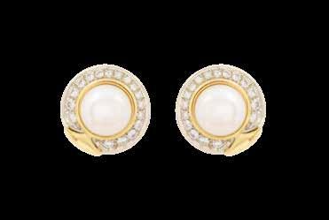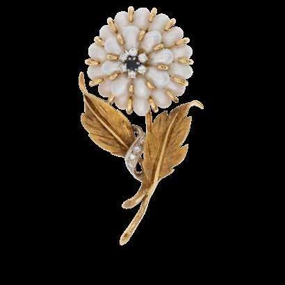 perle di fiume, uno zaffiro tondo e diamanti taglio brillante ct 0,20 circa, dimensioni 6,5x3,5 cm. peso 26 gr. € 1.000/1.300