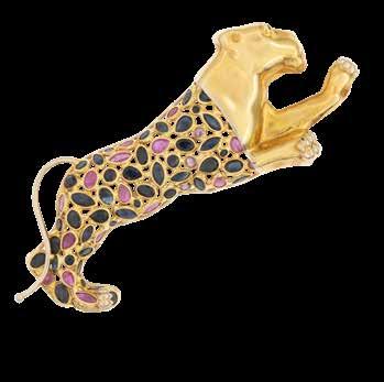 SPILLA PANTERA IN ORO GIALLO 18KT ZAFFIRI E RUBINI