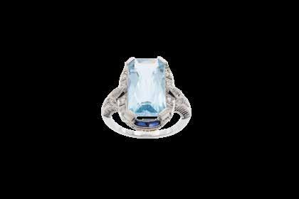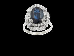 zaffiro taglio ovale misto ct 3,30 circa, privo di trattamento termico, diamanti taglio brillante e baguettes ct 1,50 circa, colore F/G - purezza VVS/SI, misura 12, completo di certificato gemmologico peso 5 gr.