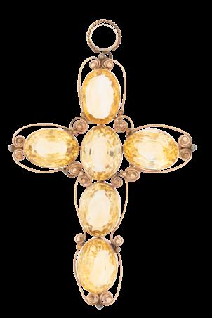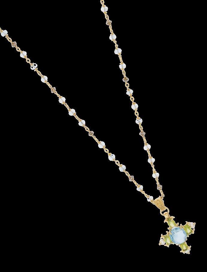 COLLANA IN ORO GIALLO 18KT E ACQUAMARINE pendente croce removibile in oro giallo 18kt topazio azzurro taglio sfaccettato, peridoti e perline, lunghezza collana 60 cm. - croce 4 cm. peso 24 gr. € 900/1.200
