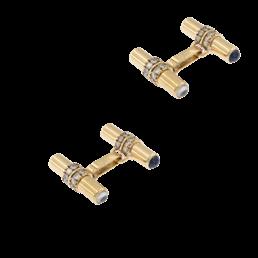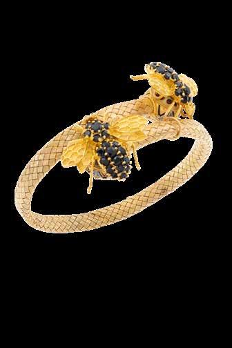 terminali a sfere decorate con smalti policromo sormontate da due api in oro giallo e zaffiri tondi, misura regolabile