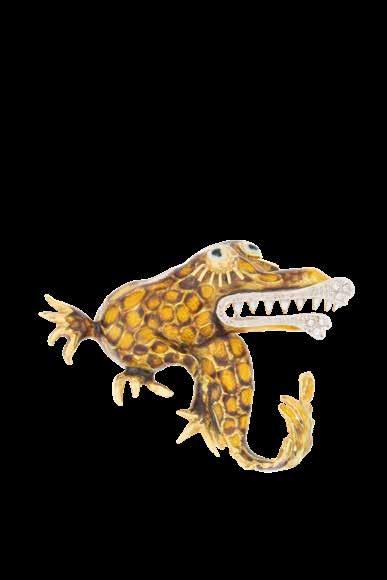 SPILLA COCCODRILLO IN ORO GIALLO 18KT, SMALTO POLICROMO E DIAMANTI taglio brillante montati in oro bianco, dimensioni 4,7x6,1 cm.