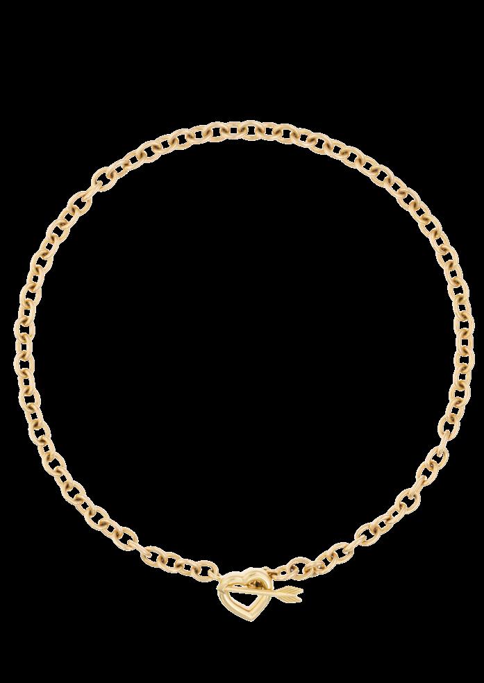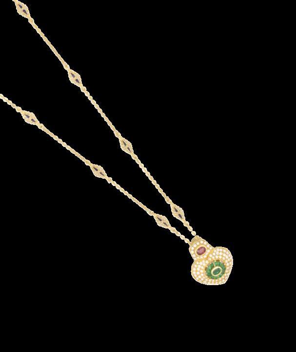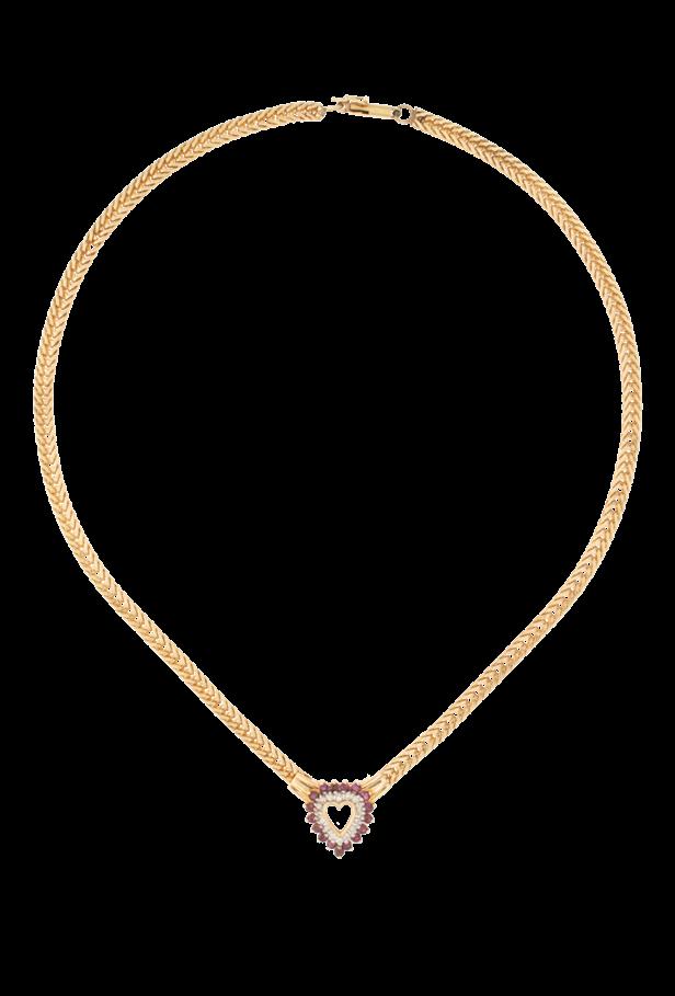 COLLANA IN ORO GIALLO 18KT CUORE CON DIAMANTI E RUBINI tondi ct 0,90 circa e diamanti taglio brillante ct 0,30 circa, lunghezza 42 cm.