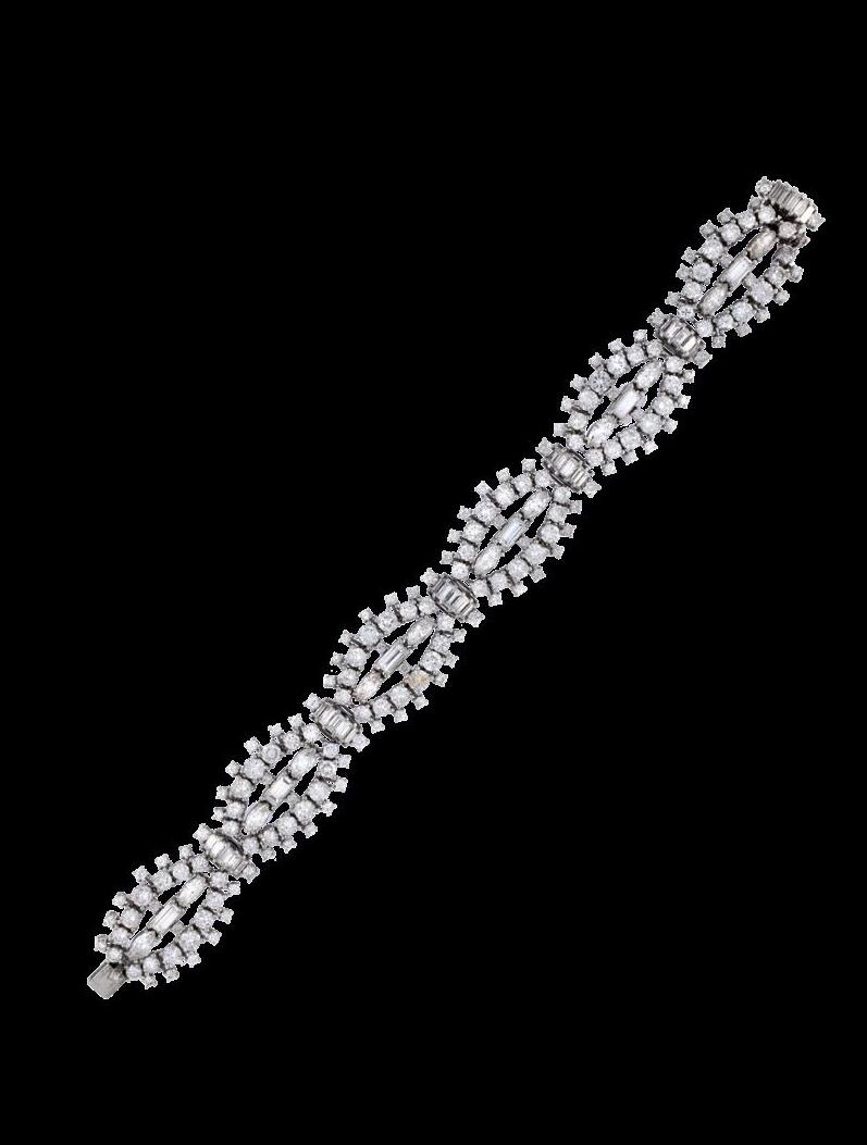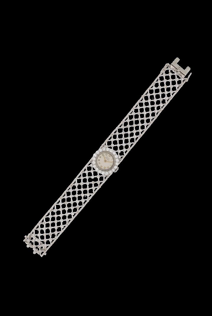 orologio da donna anni 60/70 in oro bianco 18kt, ref. 567932 - 12987 cassa 16 mm. con diamanti taglio brillante, quadrante argentato con indici, vetro sfaccettato, movimento meccanico a carica manuale, calibro 580, bracciale tennis in oro bianco 18kt e diamanti taglio brillante ct 2,50 circa, lunghezza 16 cm. cassa, quadrante e movimento firmati peso 19 gr. € 1.800/2.500