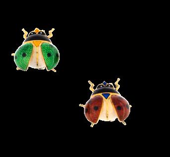 DUE SPILLE COCCINELLE IN ORO GIALLO 18KT E SMALTO POLICROMO una lievi difetti, dimensioni 2x2 cm. ciascuna