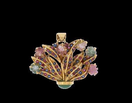 SPILLA DELFINO IN ORO GIALLO 18KT, SMALTO POLICROMO E TURCHESI