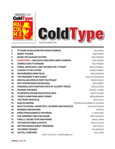 37 tears in isolation for using facebook Dave Maass Money to burn saM Pizzigati inside the sausage factory BoB Corrigan coVer story – MalcolM X was right about aMerica Chris heDges aMerica goes to ukraine PhiliP KrasKe syriza, deMocracy, and the death of a tyrant DaviD CroMwell a shock to the systeM george MonBiot we Murdered soMe folks DaviD swanson the president’s new jacket Chellis glenDinning who killed africa’s poet-politician? trevor grunDy why Visiting iran is no big deal nate roBert Venezuela gets another taste of cia dirty tricks eva gollinger fraMing the news MiChael i. niMan us iMperialisM and disaster in libya JosePh Kishore there’s soMething about henry MeDea BenJaMin the front page rule Kathy Kelly gaza in arizona toDD Miller & gaBriel M. sChivone back to school: handcuffs, leg irons and shackles John w. whiteheaD Madness and MayheM JiM Miles Media progagandists for israel CJ werleMan the terrorist feels no shaMe Mats svensson finally, an end to My nightMare saMi al-arian the war on cyber-actiVists niCole Colson getting serious about terrorisM anDy PiasCiK the greek tragedy williaM BluM i’M still confused neil ClarK