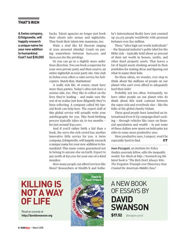 by’s International Realty have just counted up 211,275 people worldwide with personal fortunes over $30 million. These “ultra high net worth individuals” – the financial industry’s polite label for the filthy rich – typically hold about 30 percent of their net worth in houses, yachts, and other fixed property assets. That leaves a lot of liquid assets sloshing around in their portfolios for renting divas and figuring out what to name their kids. Do these ultras, we wonder, ever stop to think about the millions of people on our planet who can’t even afford to adequately feed their kids? Probably not too often. Fortunately, we have other people on our planet who do think about this stark contrast between the super rich and everybody else – like the folks at the global charity Oxfam. These good people have launched an international Even It Up campaign that’s seeking – through vehicles like taxes on financial speculation and wealth – to put some of those dollars now spent on helicopter joy rides to some more productive uses. More productive uses, I suspect, won’t be especially hard to find. CT Sam Pizzigati, an Institute for Policy Studies associate fellow, edits the inequality weekly Too Much at http://toomuch.org His latest book is “The Rich Don’t Always Win: The Forgotten Triumph over Plutocracy that Created the American Middle Class”.