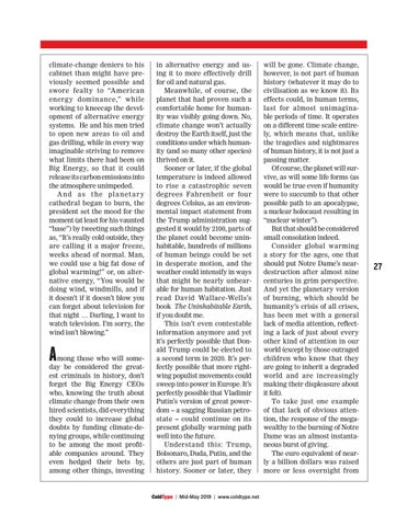 will be gone. Climate change, however, is not part of human history (whatever it may do to civilisation as we know it). Its effects could, in human terms, last for almost unimaginable periods of time. It operates on a different time scale entirely, which means that, unlike the tragedies and nightmares of human history, it is not just a passing matter. Of course, the planet will survive, as will some life forms (as would be true even if humanity were to succumb to that other possible path to an apocalypse, a nuclear holocaust resulting in “nuclear winter”). But that should be considered small consolation indeed. Consider global warming a story for the ages, one that should put Notre Dame’s neardestruction after almost nine centuries in grim perspective. And yet the planetary version of burning, which should be humanity’s crisis of all crises, has been met with a general lack of media attention, reflecting a lack of just about every other kind of attention in our world (except by those outraged children who know that they are going to inherit a degraded world and are increasingly making their displeasure about it felt). To take just one example of that lack of obvious attention, the response of the megawealthy to the burning of Notre Dame was an almost instantaneous burst of giving. The euro equivalent of nearly a billion dollars was raised more or less overnight from