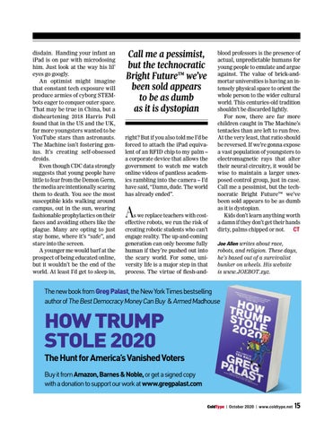 blood professors is the presence of actual, unpredictable humans for young people to emulate and argue against. The value of brick-andmortar universities is having an intensely physical space to orient the whole person to the wider cultural world. This centuries-old tradition shouldn’t be discarded lightly. For now, there are far more children caught in The Machine’s tentacles than are left to run free. At the very least, that ratio should be reversed. If we’re gonna expose a vast population of youngsters to electromagnetic rays that alter their neural circuitry, it would be wise to maintain a larger unexposed control group, just in case. Call me a pessimist, but the technocratic Bright Future™ we’ve been sold appears to be as dumb as it is dystopian. Kids don’t learn anything worth a damn if they don’t get their hands dirty, palms chipped or not. CT Joe Allen writes about race, robots, and religion. These days, he’s based out of a survivalist bunker on wheels. His website is www.joebot.xyz.