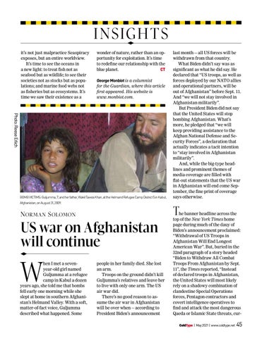 he banner headline across the top of the New York Times home page during much of the dauy of Biden’s announcement proclaimed: “Withdrawal of US Troops in Afghanistan Will End Longest American War”. But, buried in the 32nd paragraph of a story headed “Biden to Withdraw All Combat Troops From Afghanistan by Sept. 11”, the Times reported, “Instead of declared troops in Afghanistan, the United States will most likely rely on a shadowy combination of clandestine Special Operations forces, Pentagon contractors and covert intelligence operatives to find and attack the most dangerous Qaeda or Islamic State threats, curColdType | May 2021 | www.coldtype.net