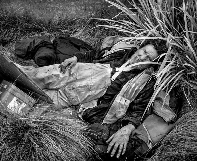 u In 2016 the Super Bowl came to San Francisco. The unhoused were ‘urged’ to move to the ironically named Division Street (right) where, city officers hoped, they would be ‘invisible’. Amid the unlimited wealth and consumption of that ‘super’ week, the unhoused went about their lives, crowded together in their tents or sleeping rough on the ground. There were no facilities, no promises of permanent housing were given.