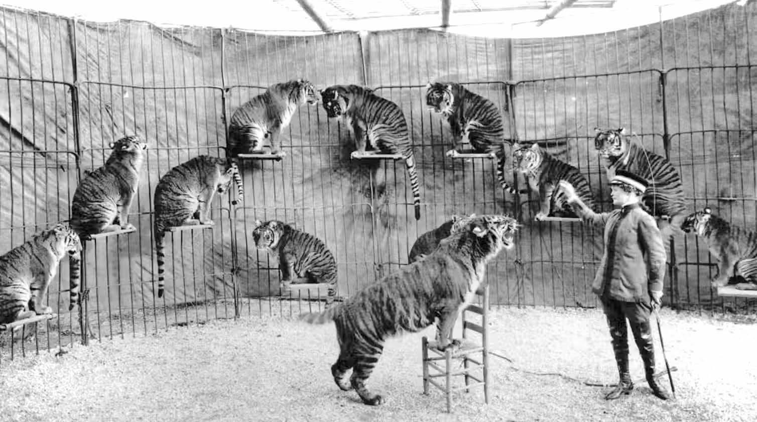 “The chute door opens as I crack my whip and shout, ‘Let them come!’ Out slink the striped cats, snarling and roaring, leaping at each other or at me. It’s a matchless thrill, and life without it is not worth while to me.” CT